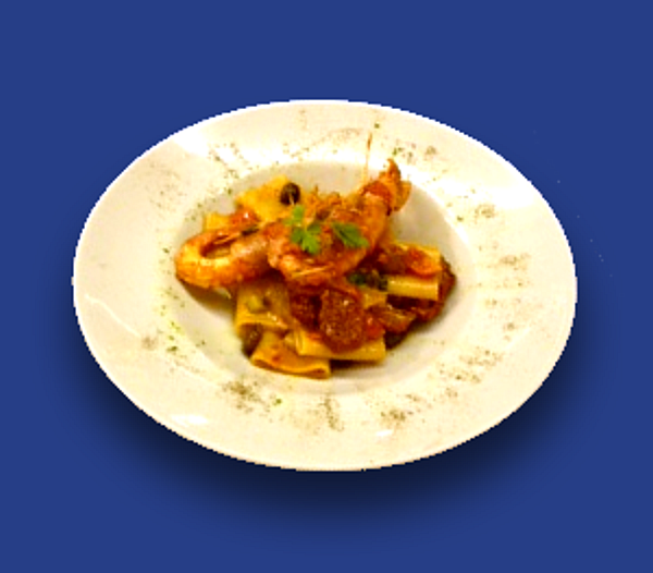 Paccheri con Gamberoni, Pomodori Secchi e Olive Taggiasche